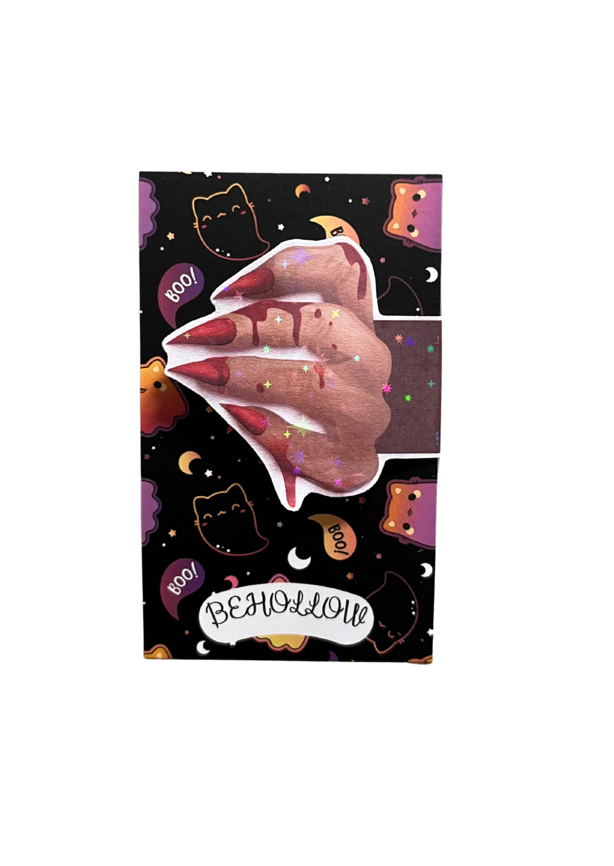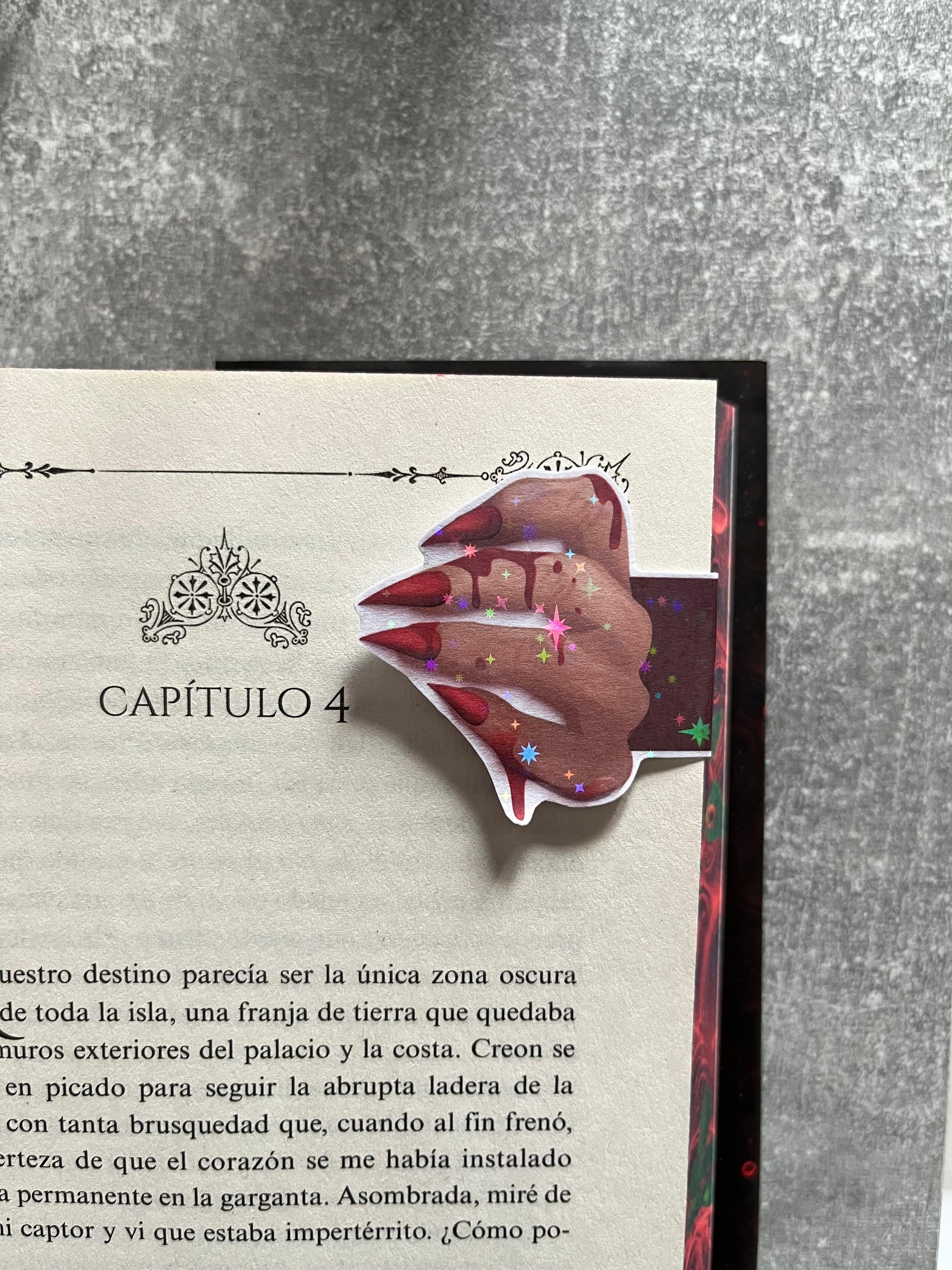 Este marcapáginas magnético combina brillo y misterio: una pieza holográfica que cambia con la luz, reflejando cada emoción que el libro despierta en ti.