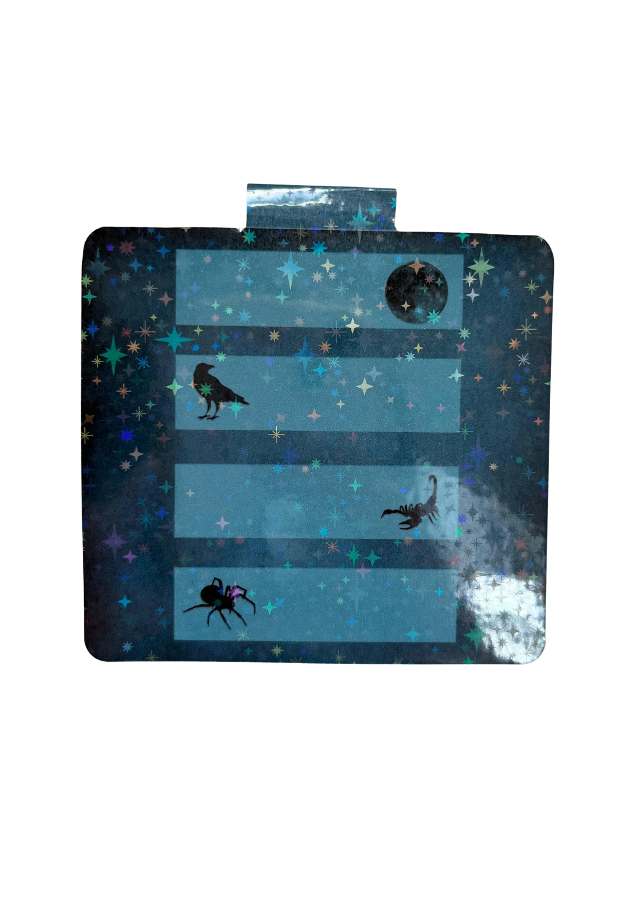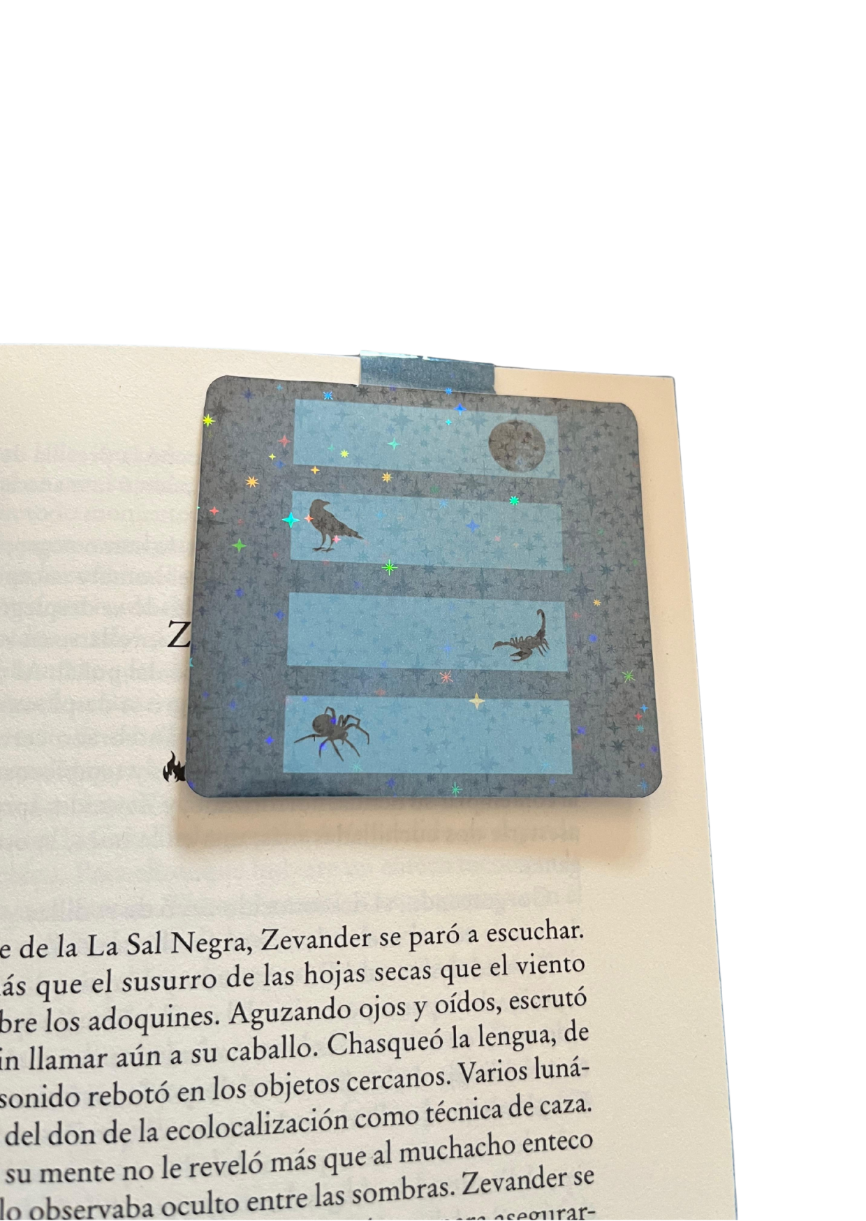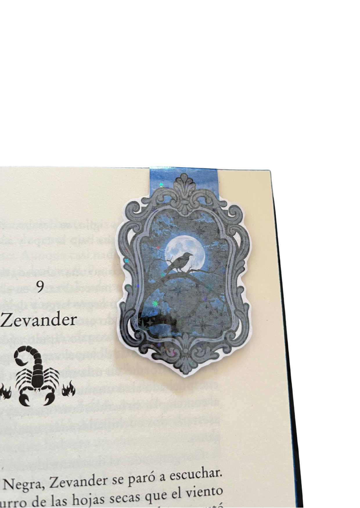 Marcapáginas magnético holográfico reversible. Por un lado encontramos la imagen gótica del cuervo en el bosque y por el otro tenemos las ranuras para colocar los post its de nuestra lectura.