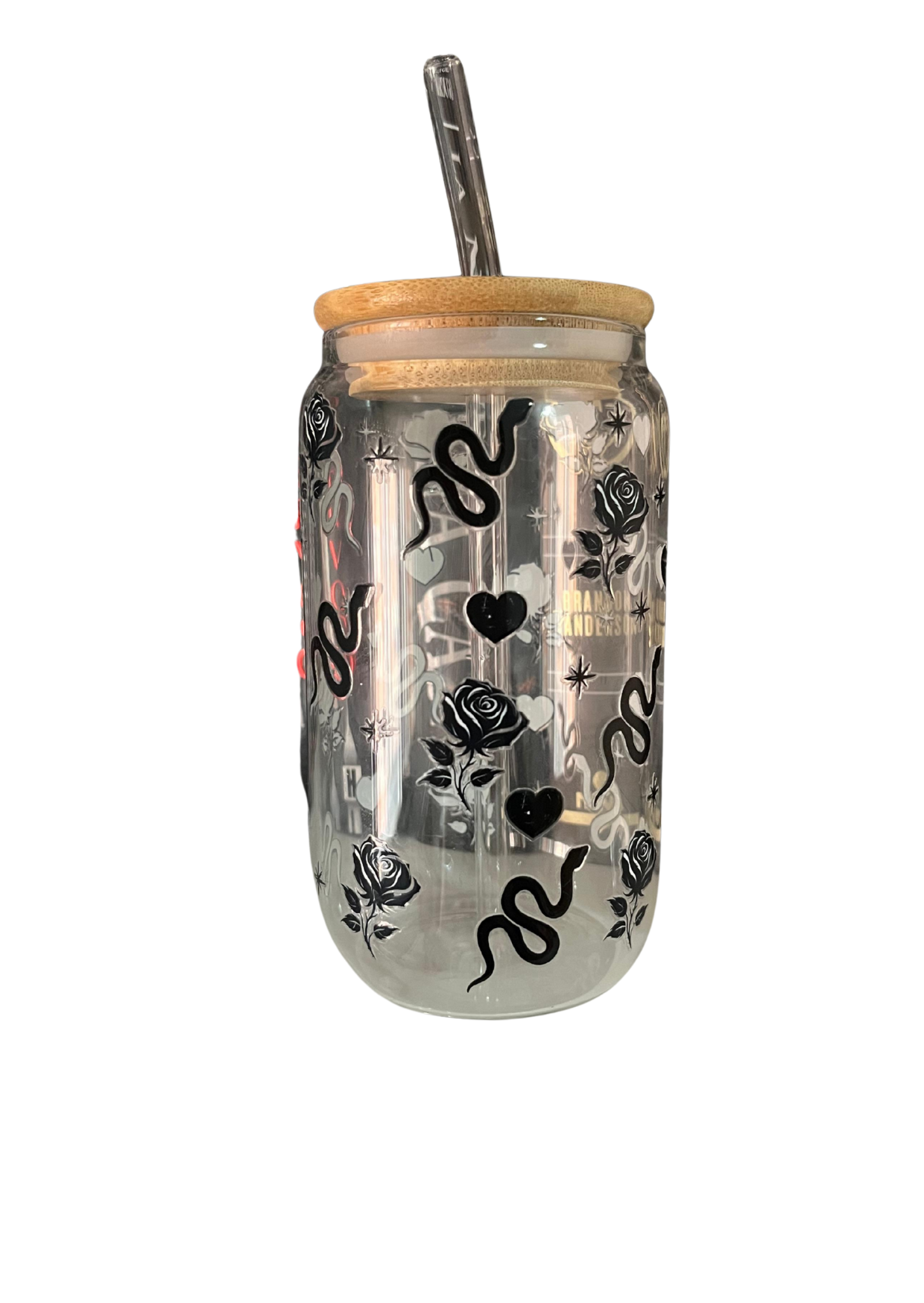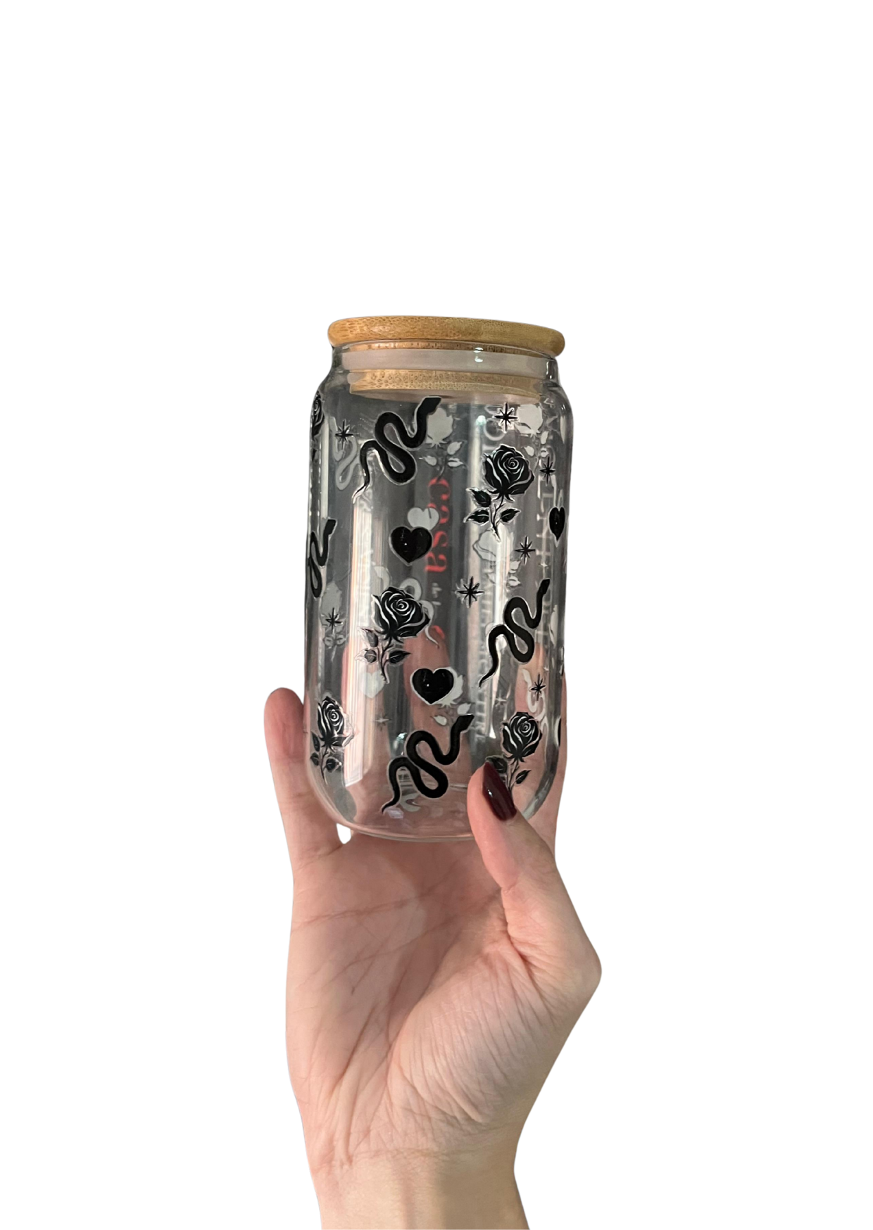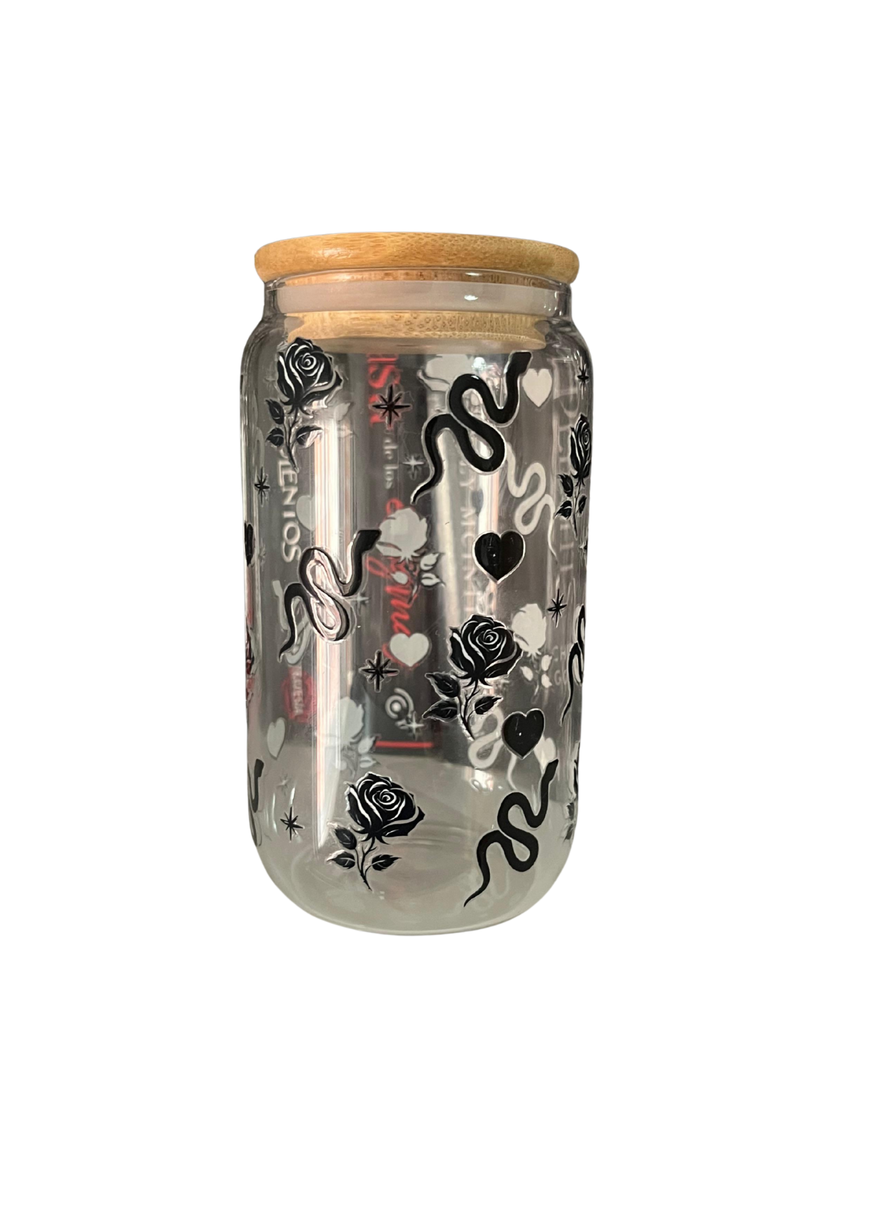 Entre sombras y pétalos marchitos, Trago de rosas marchitas guarda el misterio de lo prohibido. Su diseño entrelaza serpientes y rosas negras, símbolo de poder, deseo y renacimiento.